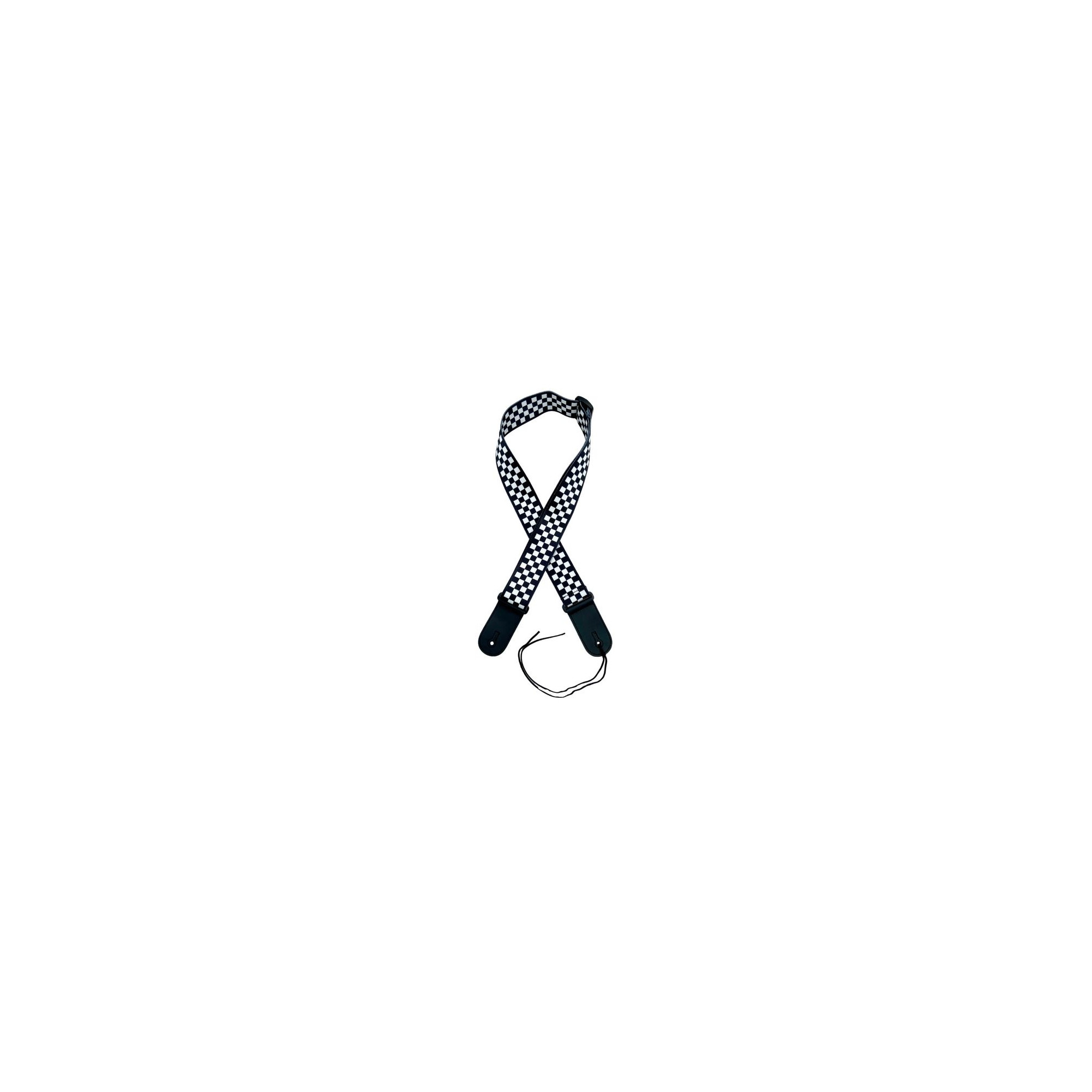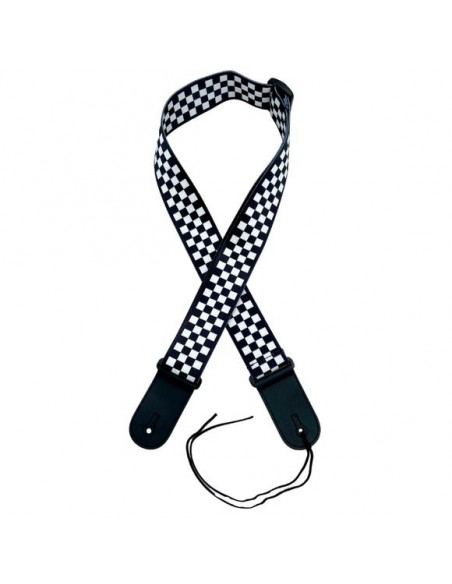 Nylon strap measuring 85 to 145 cm long for guitar, bass, and other instruments. The 5 cm wide shoulder strap is adjustable and decorated with a “checkered” pattern.