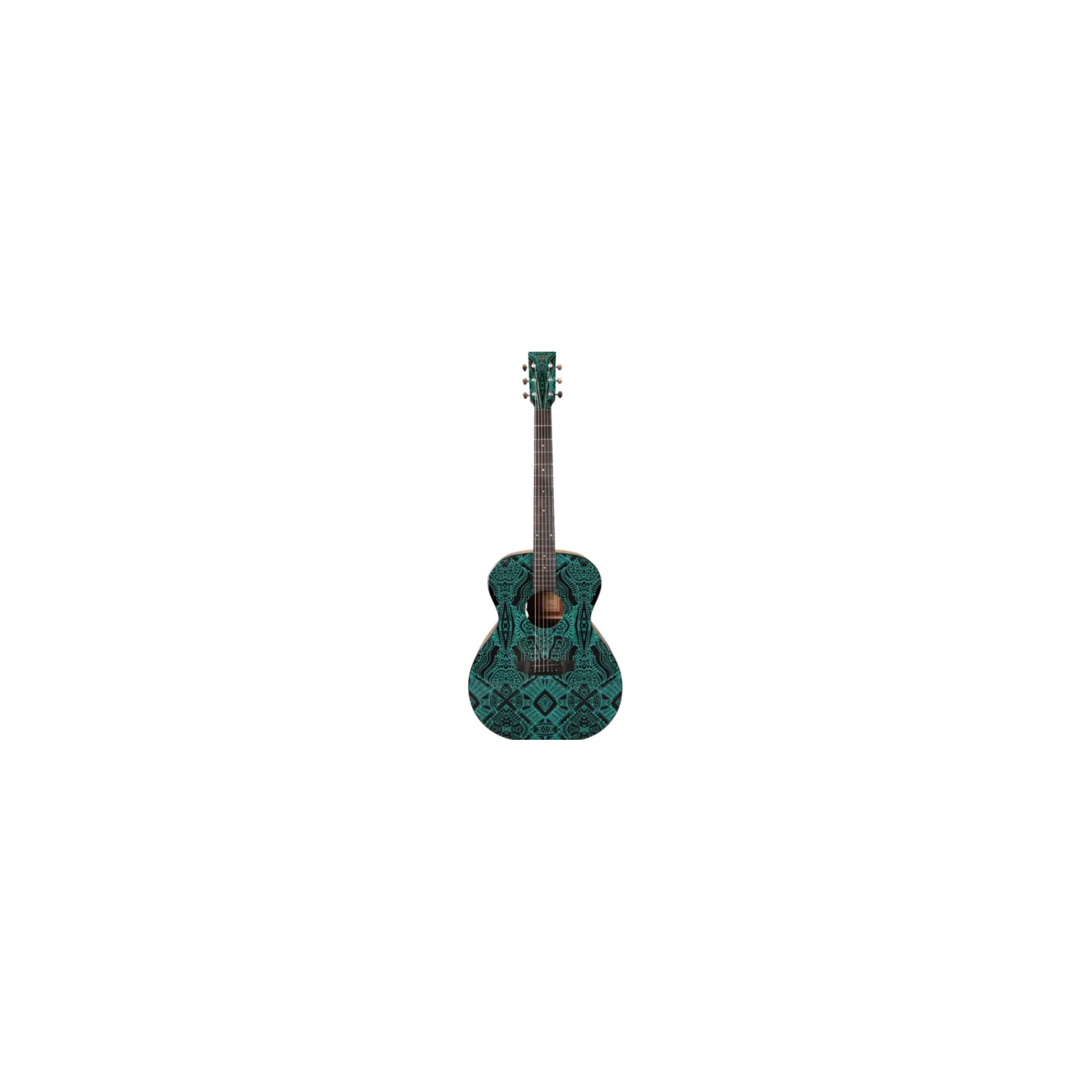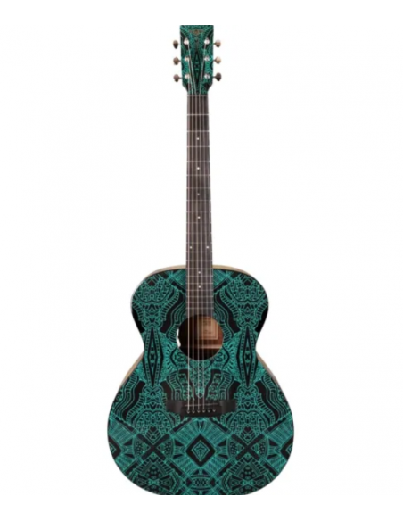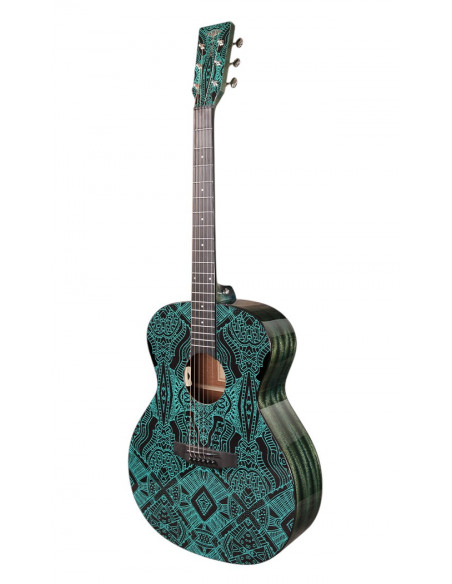 The Tyma V-3E Maze is a Grand Auditorium electro-acoustic guitar designed for players who want a versatile, comfortable instrument with a distinctive artistic flair. Its solid Sitka spruce top delivers clear, well-balanced projection, ideal for both strumming and fingerstyle. The mahogany back and sides add warmth and midrange depth, making it a great all-rounder for solo or group playing.