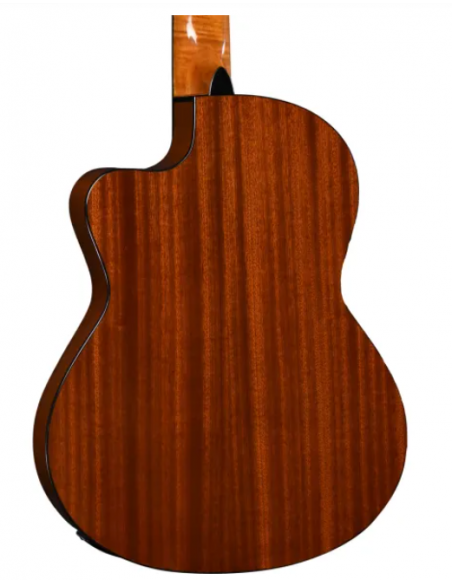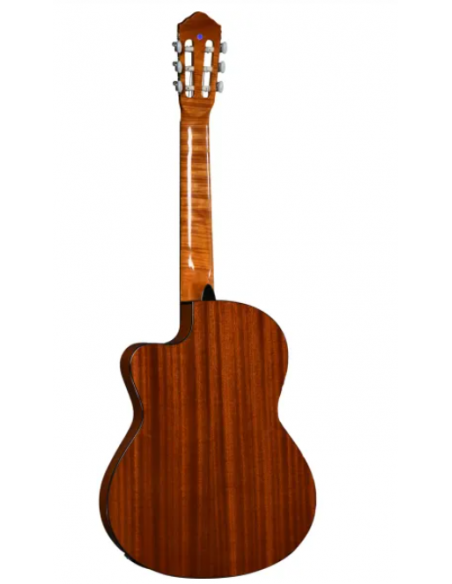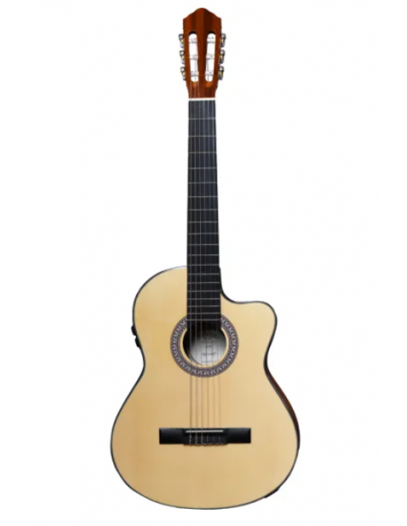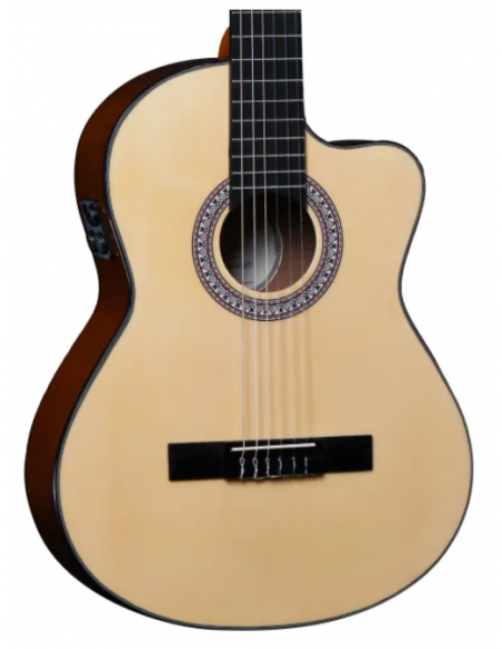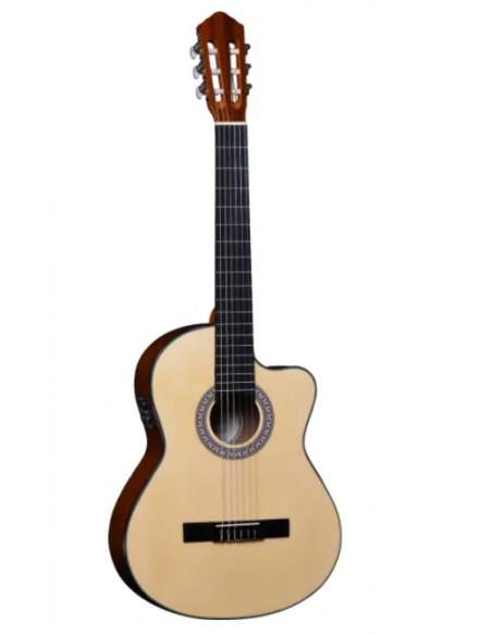 The Santana 20 is a classic acoustic/electric nylon-string guitar. The guitar is made with a laminated spruce top and laminated mahogany back and sides. The spruce adds clarity, brightness, and dynamics to the sound, while the mahogany on the back and sides adds a bit of warmth and balance to the guitar's sound, while also strengthening the guitar's resistance to temperature and humidity fluctuations. A slim cutaway allows the guitarist easier access to the highest notes of the guitar for solos and chords. In addition, the Model 20 also features a built-in microphone, so you have the option of amplifying your guitar with a guitar amplifier or vocal system, or you can record your guitar playing on your computer or other recording equipment without having to use an amp. In addition, the Model 20 also features a built-in microphone, so you can amplify your guitar with a guitar amplifier or vocal system, or you can record your guitar playing on your computer or other recording equipment without having to use a regular microphone.