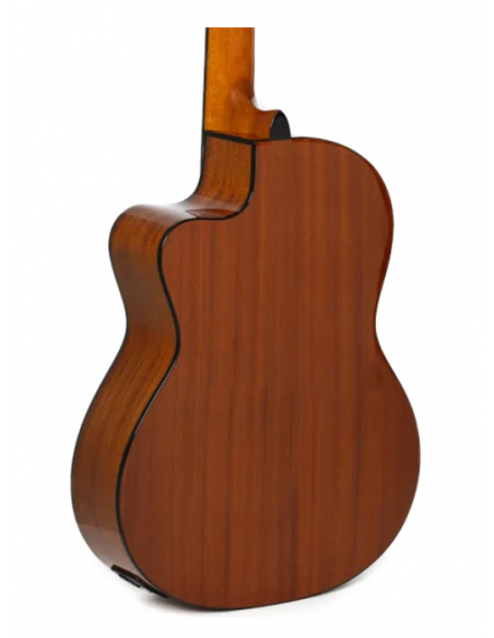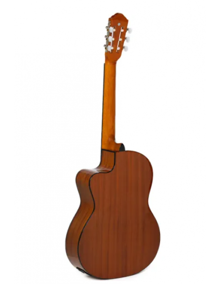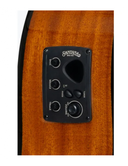 The Santana 20 is a classic acoustic/electric nylon-string guitar. The guitar is made with a laminated spruce top and laminated mahogany back and sides. The spruce adds clarity, brightness, and dynamics to the sound, while the mahogany on the back and sides adds a bit of warmth and balance to the guitar's sound, while also strengthening the guitar's resistance to temperature and humidity fluctuations. A slim cutaway allows the guitarist easier access to the highest notes of the guitar for solos and chords. In addition, the Model 20 also features a built-in microphone, so you have the option of amplifying your guitar with a guitar amplifier or vocal system, or you can record your guitar playing on your computer or other recording equipment without having to use an amp. In addition, the Model 20 also features a built-in microphone, so you can amplify your guitar with a guitar amplifier or vocal system, or you can record your guitar playing on your computer or other recording equipment without having to use a regular microphone.