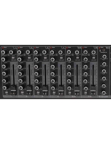 Its first four channels feature XLR inputs with mic preamps and phantom power, while channels 5/6 and 7/8 handle stereo sources such as keyboards or media players. Channel 9/10 includes RCA and mini-jack inputs for portable devices. Each channel includes gain control with peak indicator and a 3-band EQ for accurate tonal shaping.