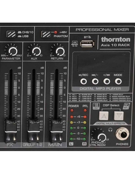The Thornton AXIS10 Rack is a versatile rack-mountable mixer offering 10 channels, USB connectivity, Bluetooth streaming, onboard effects and an integrated MP3 player. Designed for small to medium setups, mobile performers, rehearsal rooms and compact installations, it delivers reliability and intuitive operation.
