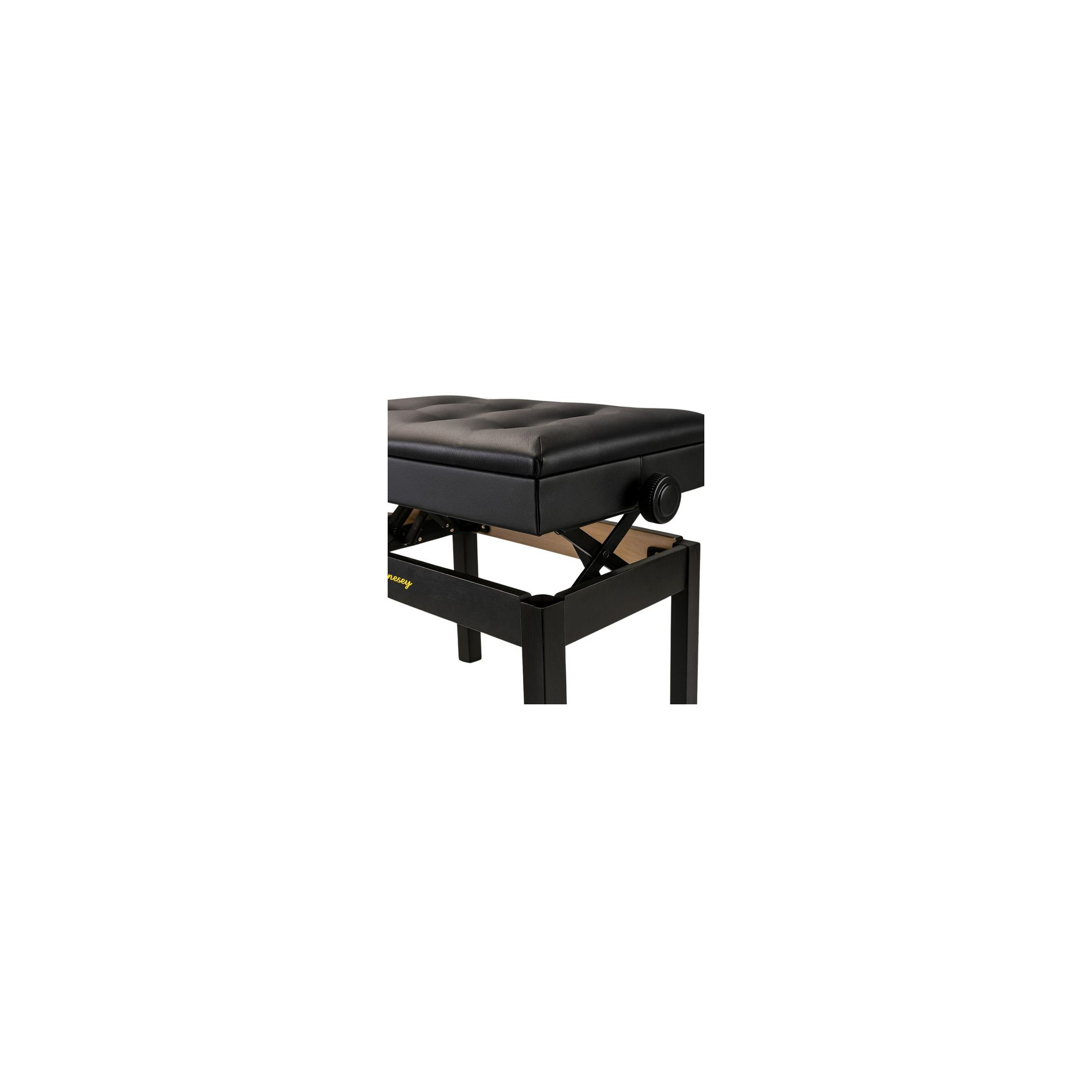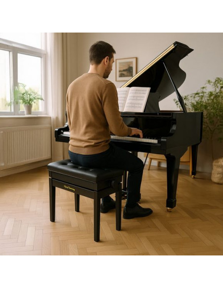 Made of solid wood with a glossy black lacquer finish, this bench adds a touch of classic elegance. Its solid structure ensures perfect stability, even with intensive daily use. The generously padded cushion, covered in soft and durable black imitation leather, ensures lasting comfort. Thanks to the height adjustment system, you can precisely adjust your playing position for an optimal ergonomic experience.
