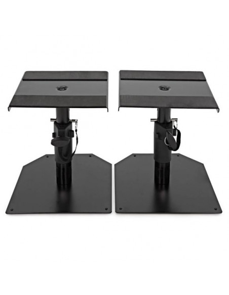 Pair of desktop speaker stands designed for studio monitor use. These stands allow you to position speakers at an optimal height on a desk while reducing vibrations thanks to anti-slip surfaces. Height adjustment is easy and secure, even for heavier speakers.
