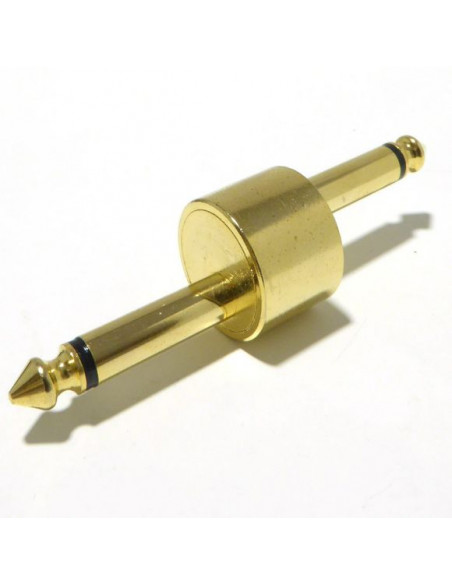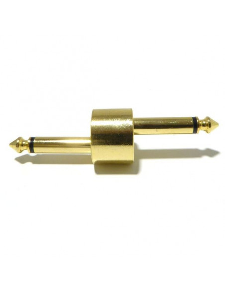 Male-to-male jack adapter with gold-plated connectors, designed to directly connect two guitar pedals. It allows pedals to be placed tightly together without using a patch cable.