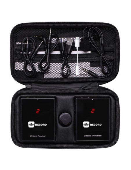Wireless microphone system with transmitter, receiver and omnidirectional lavalier microphone. It improves audio quality for videos and interviews by capturing the voice close to the source. Compatible with iPhone, iPad, Android, DSLR and video cameras, with a range of up to 100 meters.