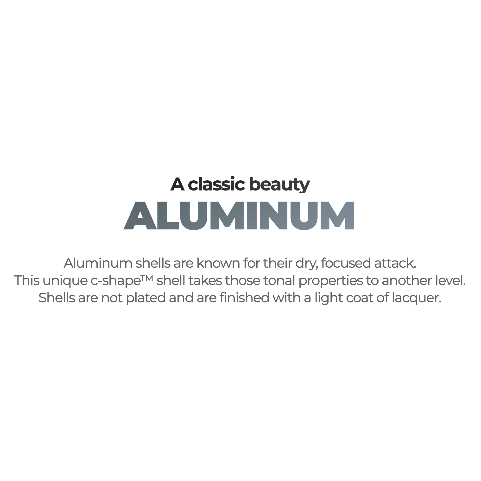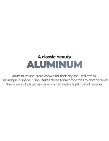 Les fûts en aluminium sont connus pour leur attaque sèche et précise. La forme unique de fût c-shape™ dont le procédé a été développé par DS DRUM durant 2 annnées apporte des propriétés tonales exceptionnelles. La forme du fût a été intégralement revu, ainsi les pates coté frappe et coté bottom n'ont pas le même angle, épaisseur et longueur. Ce procédé a permis notamment d'obtenir un son rond, soft coté bottom et un maximum de précision coté frappe. Tous les fûts sont finis avec une légère couche de laque. Disponible aussi en Laiton et en cuivre : un prix abordable pour un son térrifiant.