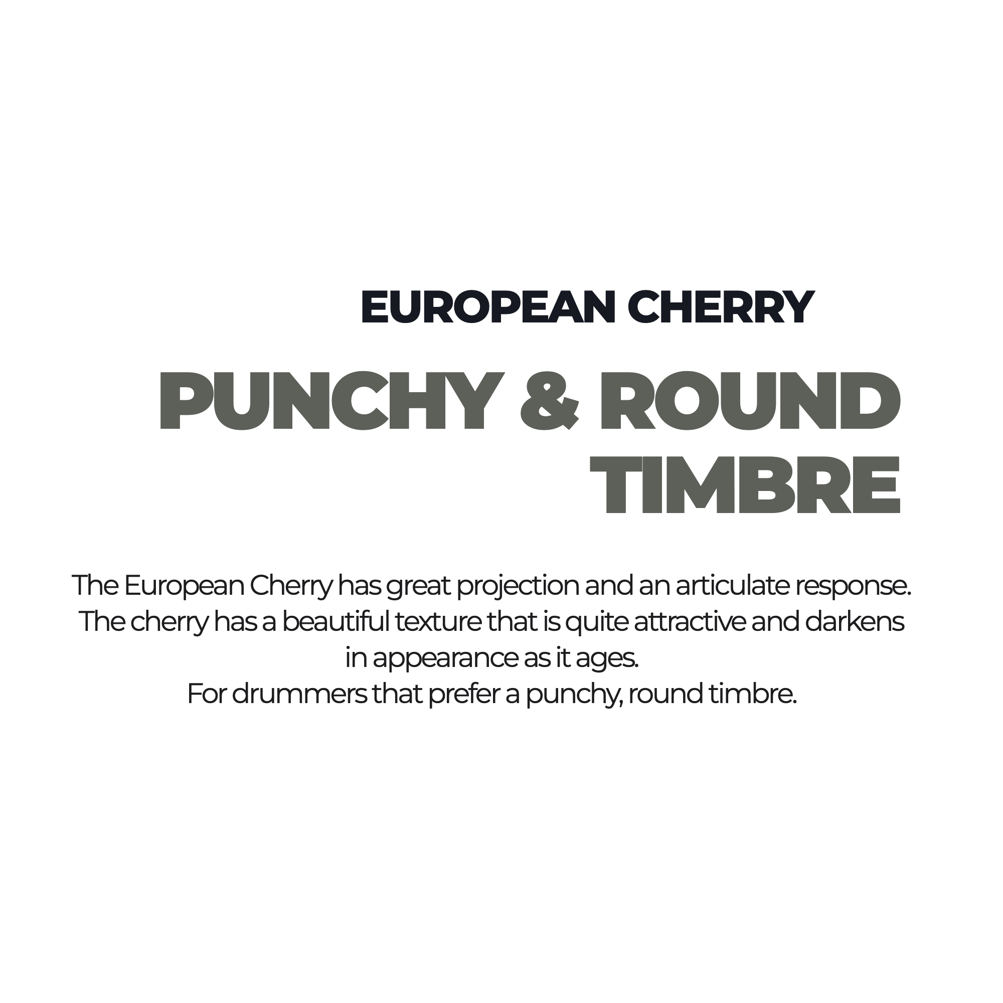 Le cerisier européen a une grande projection et une réponse articulée. Il a une belle texture qui est assez attrayante et s’assombrit en apparence à mesure qu’il vieillit. Pour les batteurs qui préfèrent un timbre rond et percutant. Disponible en 14"x6.5" et 14"x5.5", le cerisier est une caisse claire unique visuellement impréssionnante avec des tonalités fabuleuses, un must have.