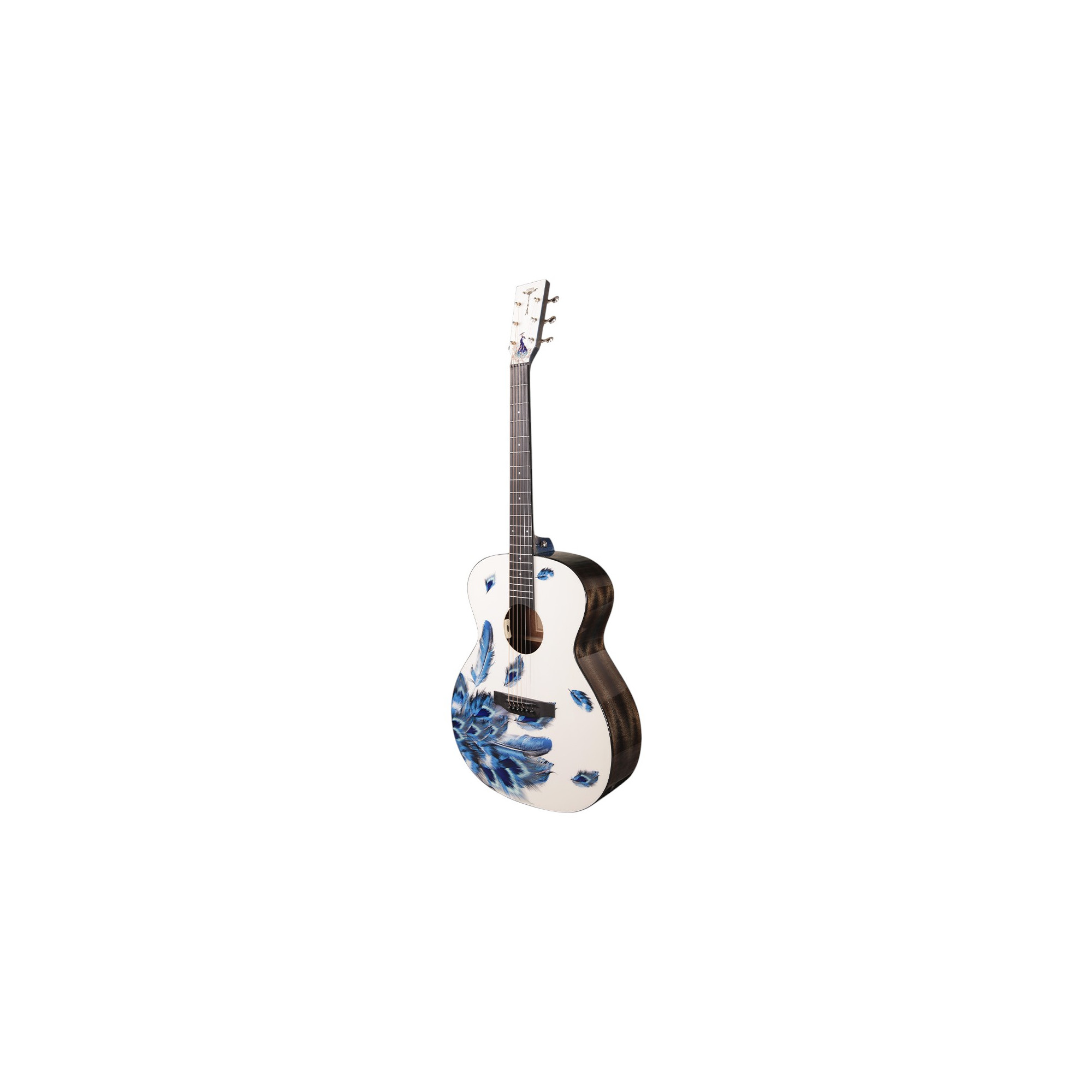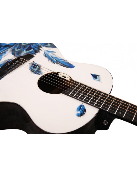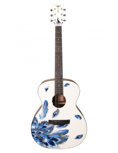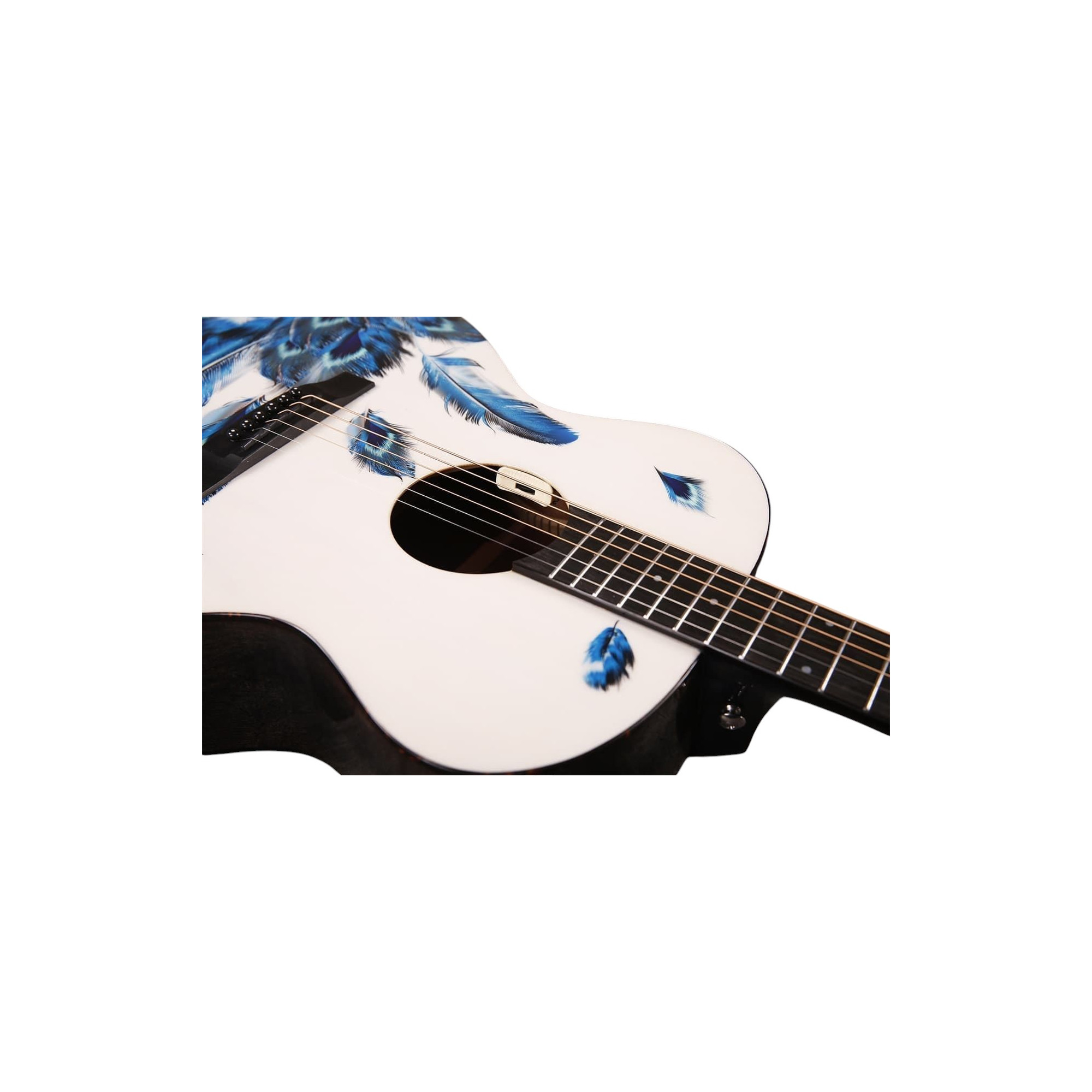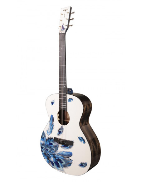 Le motif "Plume" gravé au laser sur la table lui confère un look raffiné et artistique. Son manche en acajou et sa touche en Ébène reconstitué garantissent confort de jeu et stabilité.