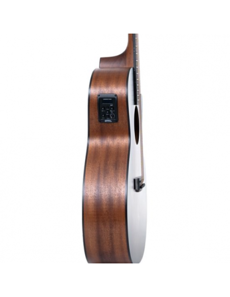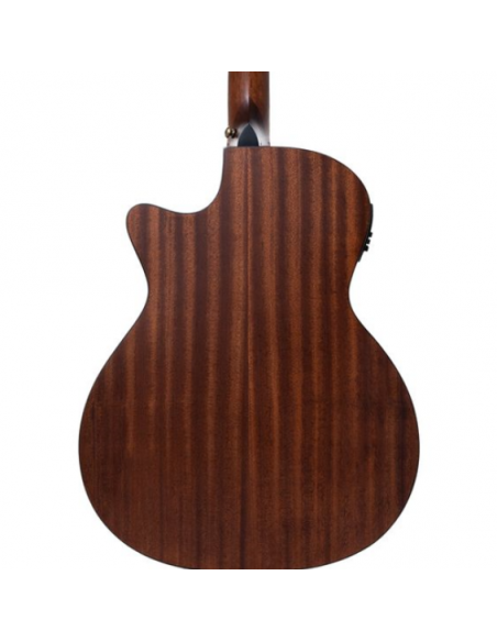Sa table en épicéa offre un son clair, net et réactif, tandis que ses dos et éclisses en sapelli lui apportent une belle profondeur sonore, des médiums riches et des basses rondes. Le manche en acajou oriental et la touche en Purple Heart noir confèrent robustesse et élégance, avec une excellente tenue et un toucher agréable.