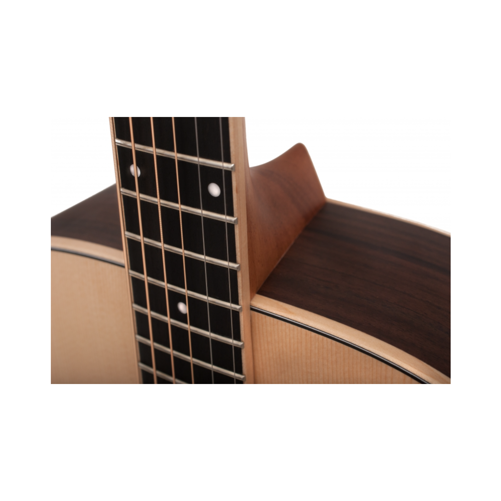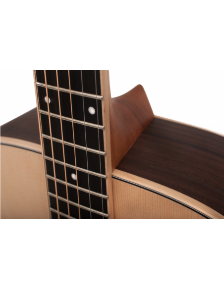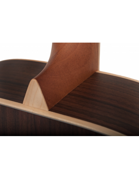 Elle associe une table en épicéa Sitka massif à un dos et des éclisses en palissandre indien massif, offrant un spectre sonore riche : basses profondes, médiums clairs et aigus détaillés.