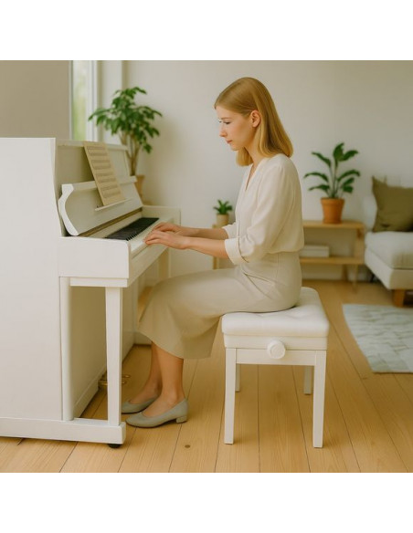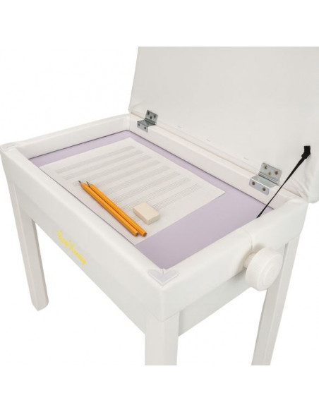 Discret mais spacieux, le compartiment situé sous l’assise permet de ranger facilement vos partitions, crayons, accordeurs ou petits accessoires – tout ce qu’il faut à portée de main.