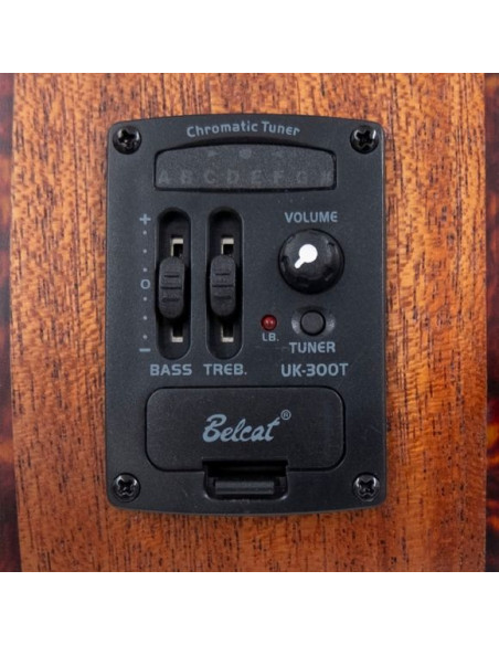 Le U6 T est un ukulélé au format tenor, conçu pour les musiciens qui recherchent une sonorité plus profonde et une projection renforcée par rapport aux tailles soprano/concert. Sa table en acajou massif délivre un timbre chaleureux et riche en harmoniques, tandis que le dos et les éclisses en acajou apportent de la rondeur et de la stabilité au son. Le corps avec pan coupé facilite l’accès aux frettes aiguës pour un jeu plus libre. Équipé d’un préampli Belcat EQ avec micro intégré, il se branche directement sur un ampli ou une interface d’enregistrement en conservant un rendu naturel. Les mécaniques fermées Grover garantissent une tenue d’accord fiable. La touche et le chevalet en noyer noir offrent confort et précision, et la finition satinée complète un instrument prêt pour l’accompagnement, le jeu mélodique et la scène.